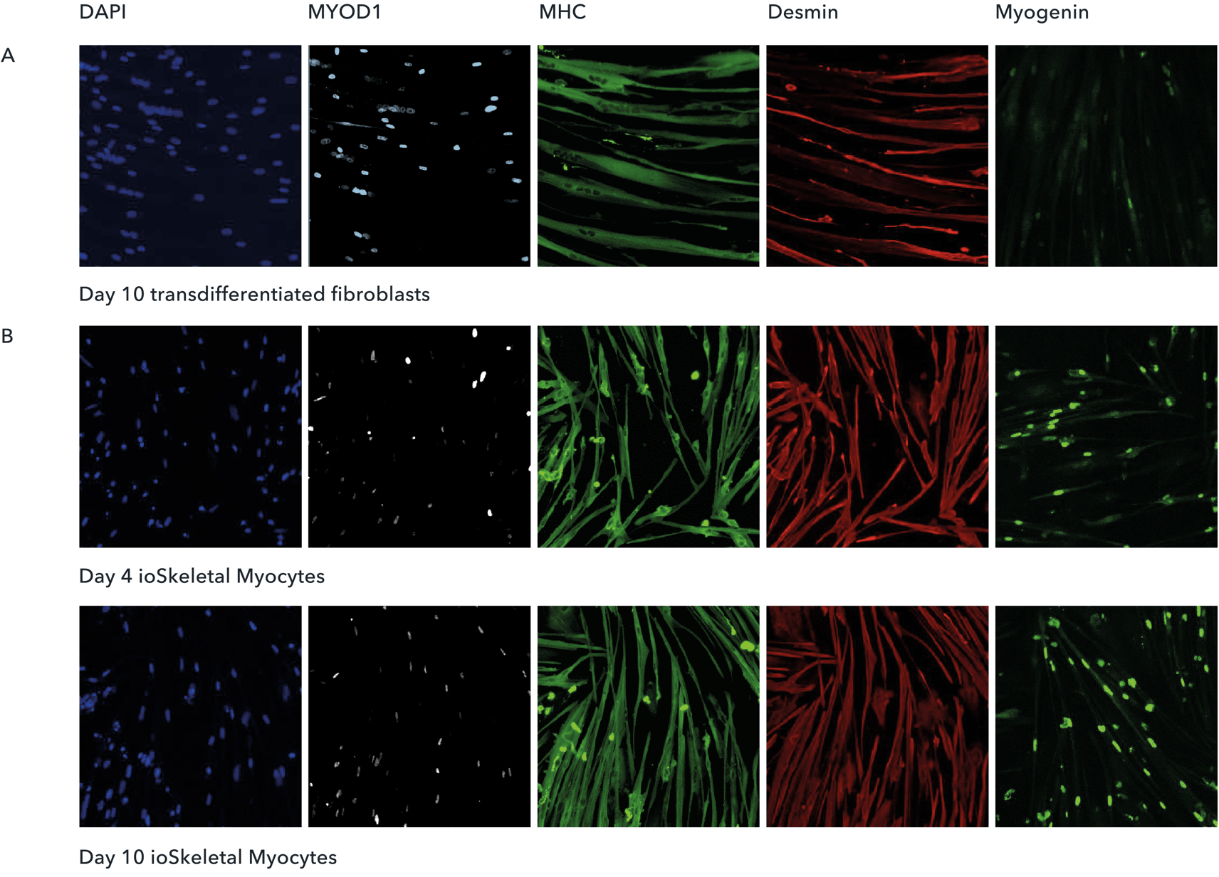ioSkeletal Myocytes, are human iPSC-derived skeletal myocytes deterministically programmed using opti-ox technology. The cells are delivered cryopreserved and upon revival they mature rapidly, forming elongated, striated, multinucleated muscle cells expressing key myofilament proteins such as desmin and myosin heavy chain within 10 days.