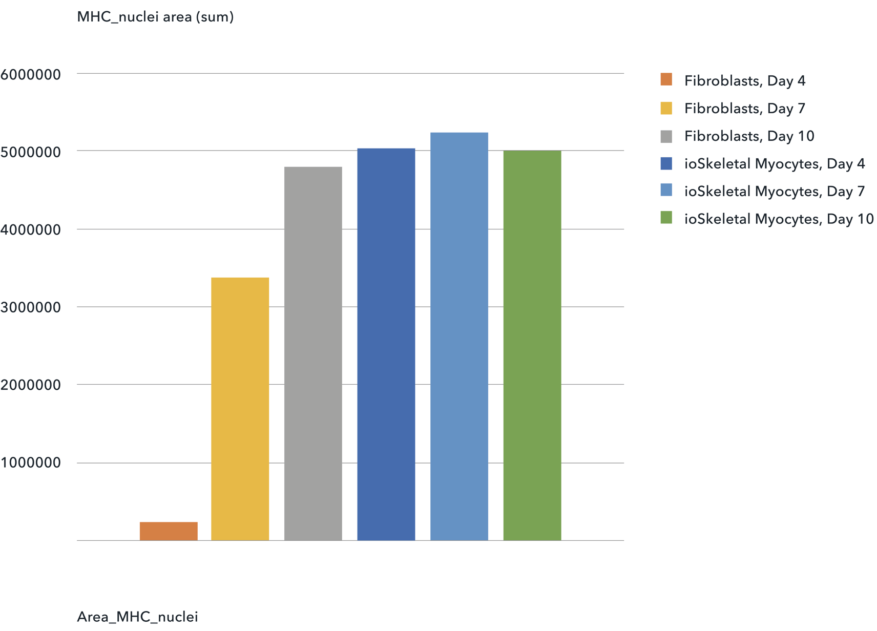 (A) Immunocytochemistry | Human fibroblasts were transduced with lentiviral vectors allowing inducible over-expression of MYOD1 to transdifferentiate them to myocytes in approximately 10 days. Transdifferentiated myotubes were stained for multiple myotube markers to assess the purity and degree of multi-nucleation. (B) Immunocytochemistry | ioSkeletal Myocytes generate myocytes within as little as 4 days post-revival with a high-degree of MHC+ cells (>80% purity), suitable for phenotypic based high throughput screens. (C) Myosin Heavy Chain Positive Cells | The total area of MHC positive cells generated is similar in a comparison between ioSkeletal Myocytes and transdifferentiated fibroblasts.