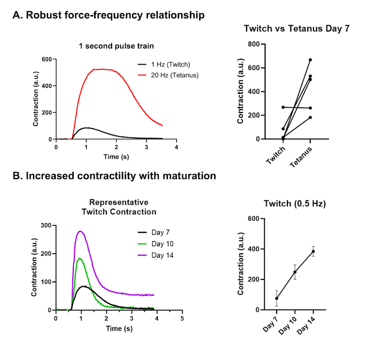 Cells contract in 2D and 3D muscle bundles in response to electrical, chemical and pharmacological stimuli.