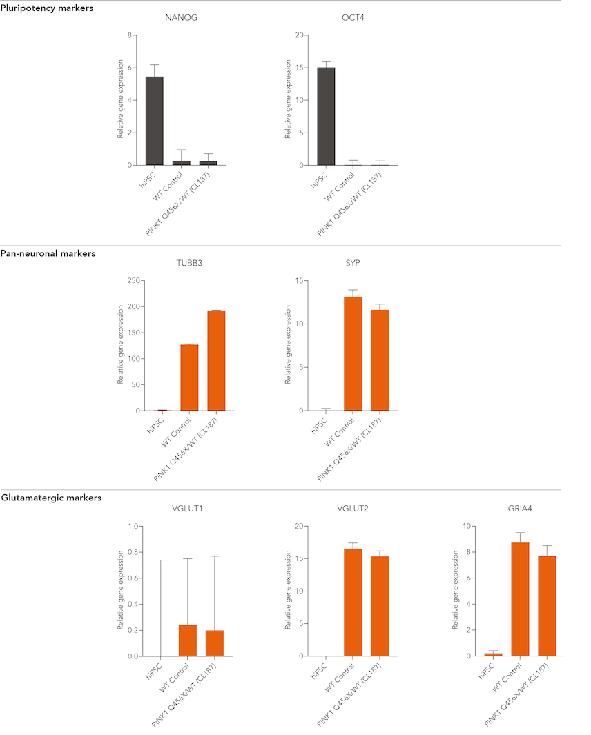 Gene expression analysis demonstrates that ioGlutamatergic Neurons PINK1 Q456X/WT and wild-type ioGlutamatergic Neurons (WT Control) lack the expression of pluripotency markers (NANOG and OCT4) at day 11, while expressing pan-neuronal (TUBB3 and SYP) and glutamatergic-specific (VGLUT1 and VGLUT2) markers, as well as the glutamate receptor GRIA4. Gene expression levels were assessed by RT-qPCR (data normalised to HMBS; cDNA samples of the parental human iPSC line (hiPSC) were included as reference). Data represents day 11 post-revival samples, n=2 replicates.